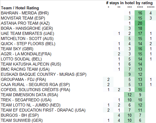 At Le Tour, difference between the team with best rating hotels average and the team with the worst one is about 0.48 (Astana, 3.76; Bora-Hansgrohe, 3.29), more than a half that the difference that we observe at La Vuelta.