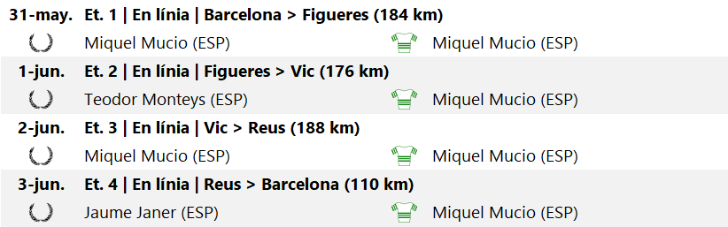 - Juan JUAN (ESP) +34m40s; 5. Jaume JANER (ESP) +38m40s; 6. Antonio TORRELL (ESP) +58m49s; 7. Pere SANT (ESP) +1h6m13s; 8. Manuel ALEGRE (ESP) +1h8m2s; 9. Jose Mª SANS (ESP) +1h30m36s; 10. Miguel GARCÍA (ESP) +1h38m23s; (…) i 27. Pablo GIESSMANN (GER) +9h50m0s