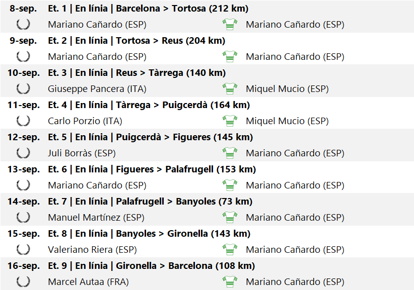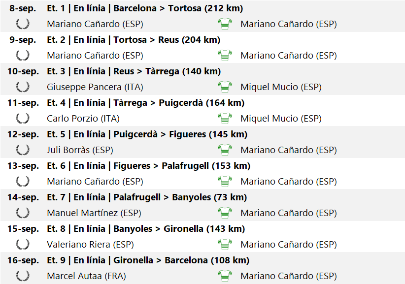 - Valeriano RIERA (ESP) +56m18s; 5. José FIGUERAS (ESP) +57m49s; 6. Manuel MARTÍNEZ (ESP) +1h3m28s; 7. Juan SEGARRA (ESP) +1h10m9s; 8. Ricardo FERRANDO (ESP) +1h25m59s; 9. Joan BIBILONI (ESP) +1h27m48s; 10. Jose Mª PALLARÉS (ESP) +1h35m0s; (…) i 40. Francisco CASADEMUNT (ESP) +20h10m3s