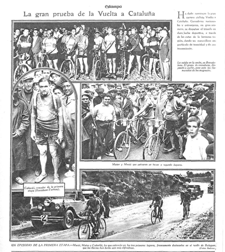 La primera jornada fou molt dura a causa del mal temps. Un diluvi -amb tempesta d’aparell elèctric- acompanyà els corredors quan aquests arribaren a les Costes del Garraf. Una caiguda en un pas a nivell a Sitges provocà la primera selecció decisiva de l’etapa i de la “Volta”. Un grup amb Cañardo, Muç, Borrás, Mateu, Antaa i Porzio quedà destacat. Però els incidents continuarien quan, a Constantí, un carro tirà a terra aquest primer grup en creuar-se’ls l’animal. Antaa -amb una ferida al cap- i Porzio -amb una roda trencada- foren els més desafortunats. Dels quatre restants, Borràs acabà cedint a l’alçada de l’Hospitalet de l’Infant després de patir dues punxades. Mariano Cañardo aconseguí fer-se amb la seva primera victòria d’etapa a la “Volta” després d’imposar-se a l’esprint a Muç i a Mateu. Borràs fou el següent en arribar amb set minuts perduts. Aquella primera etapa ja donà forma a la classificació general i deixà fins a vuit abandonaments.