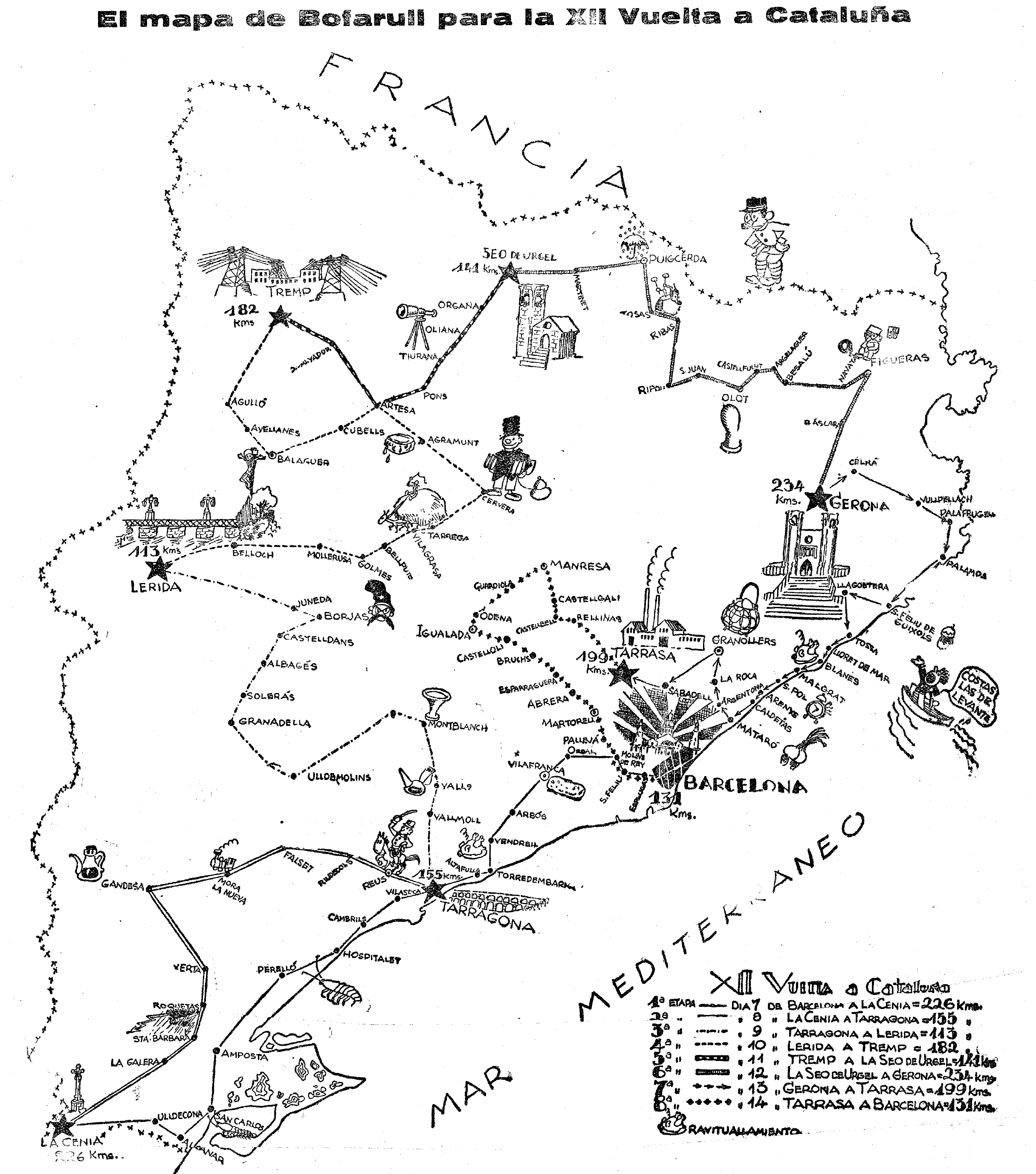 Com venia sent habitual, a les tres de la matinada s’inicià la “Volta” des del velòdrom de Sants. L’etapa transcorregué de forma anòmala en el sentit que la gran batalla es disputà en els primers cent quilòmetres. Al poc de començar, a l’inici de la pujada a l’Ordal a Cervelló, atacaren Juan Mateu junt amb Giuseppe Pancera, que en coronar treien dos minuts al grup, del que tirava -sense perdre els nervis- Cañardo. Es reagruparen tots a l’Arc de Berà gràcies a l’empenta del d’Olite i a la falta d’entesa en el duet capdavanter. La calor marcà la segona meitat d’etapa, alguns membres del grup posaren peu a terra i saquejaren unes vinyes, poca gràcia li faria al propietari a qui li feien la verema abans d’hora. Poc després, d’altres s’aturaren per refrescar-se amb l’aigua d’una sínia. Tot i això, alguns corredors com Cañardo, Pancera, Pons o Sants refusaren aquests petits plaers i seguiren endavant. Cañardo forçà el ritme a l’entrada d’Alcanar i acabà quedant-se sol amb Pedro Sant, a qui va batre a l’esprint a La Sénia. Pancera arribà amb 1’40” perduts i confessà que va veure’s obligat a aturar-se a una taverna perquè li havia entrat una gana com mai: “he agafat un tros de pa, hi he ficat peix i ho he devorat com una fera”.