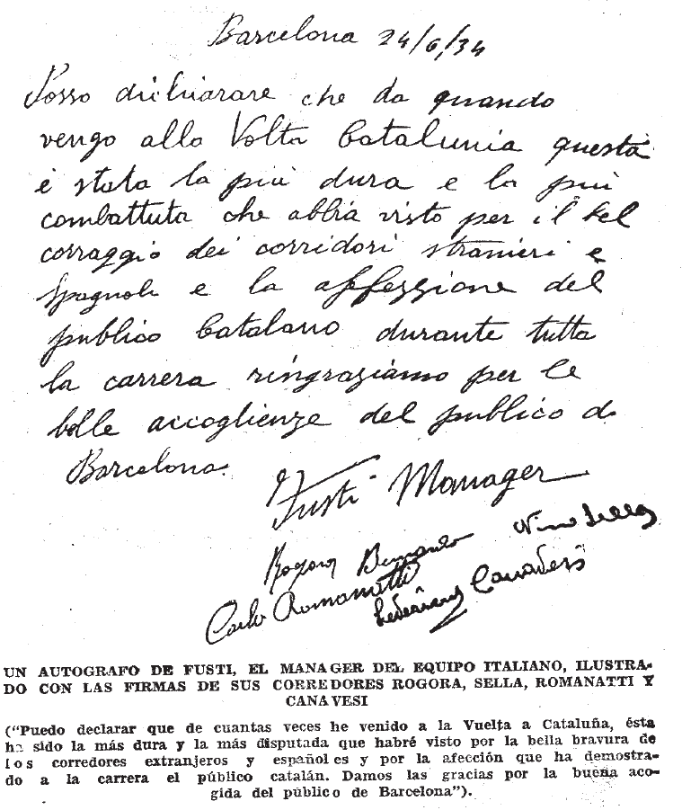 Una de les novetats que presentava la “Volta” de 1934 fou la inclusió d’una contrarellotge individual. Va ser en el primer sector de la setena etapa: 55 quilòmetres entre La Bisbal i Girona, amb l’alt de Santa Pellaia com a dificultat orogràfica. L’ordre de sortida es definia per pur sorteig, independentment de la classificació general, això despistà a bona part del públic doncs no coneixien ben bé com funcionava aquesta modalitat i quedaven perplexos en veure l’ordre en què passaven els corredors. Nino Sella marcà el millor registre a Girona mentre que Cañardo seguia amb la seva mala sort patint una nova punxada i deixant-se 1’26” respecte el vencedor (40” respecte Rogora).