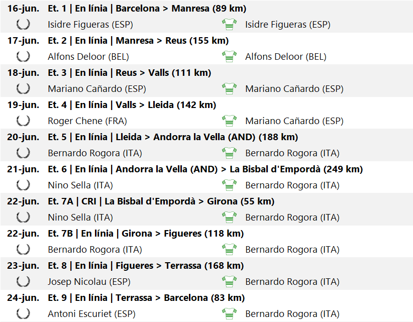 La darrera etapa donava poques esperances a canvis a la general, amb només 83 quilòmetres entre Terrassa i Barcelona incloent-hi un circuit de 10 voltes a Montjuïc. El valencià Antoni Escuriet atacà a la cinquena volta, però passà del tot desapercebut: cada cop que completava una volta el públic pensava que era un corredor endarrerit. La gentada ovacionava els esprints del grup -que en veritat eren pel segon i tercer lloc-. Escuriet creuà meta, oficialment com a victoriós, però davant la incredulitat es veié obligat a completar una volta més “per si de cas”. Mentre a la tribuna coronaven els vencedors de la resta de classificacions, el valencià arribava plorant a meta veient com l’esforç realitzat no havia quedat recompensat, i és que fins i tot els comissaris opinaven com el públic. Al final els corredors del grup principal i el jutge de meta admeteren la victòria d’un Escuriet que un any més tard esdevindria el primer espanyol en guanyar etapa i ser líder a la Vuelta a España, seria en la segona etapa de la seva primera edició.
