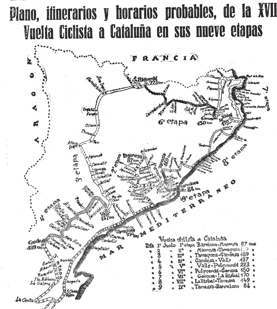 Com venia sent tradició, des de davant del Bar “La Pansa” de la Plaça Espanya de Barcelona es donava la sortida de la primera etapa de la “Volta”. Era una jornada molt curta (87 km) camí de Manresa que va fer que els corredors es disputessin a l’esprint la victòria on s’imposà el belga Joseph Huts. El fet que arribessin junts i amb el dipòsit ple, provocà una caiguda a 100 metres de l’arribada, en la que un dels més afectats fou Salvador Cardona, que va perdre 2’40”.