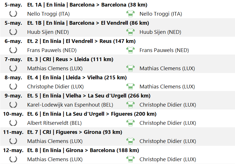 Mathias Clemens no errà en els pronòstics de favorit a la contrarellotge entre Figueres i Girona, de 93 quilòmetres. El luxemburguès s’imposà amb autoritat marcant una mitjana de 36,4 km/h. Aconseguí un ampli marge de 5’23” sobre el segon -Didier- i 8’33” sobre Cañardo, a qui avançava en la classificació general col·locant-se segon, a 7’53” del mallot groc, Didier. Clemens no deixà el protagonisme a l’endemà, en un dia en què havia de defensar la segona plaça amenaçada pels 66 segons de diferència que tenia amb Cañardo. El luxemburguès va fer valer l’expressió “la millor defensa és un bon atac” i accelerà a Sant Boi de Llobregat, aconseguint un marge d’un minut i mig a l’entrada del circuit de Montjuïc, on les vuit voltes li serviren per ampliar encara més el seu marge i endur-se la victòria d’etapa amb 2’57” sobre Trueba, que guanyava la general de la muntanya, i 3’27” sobre el grup principal.