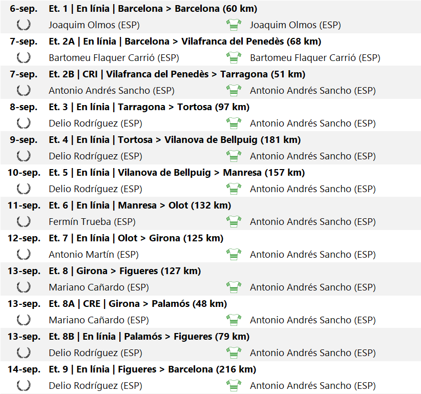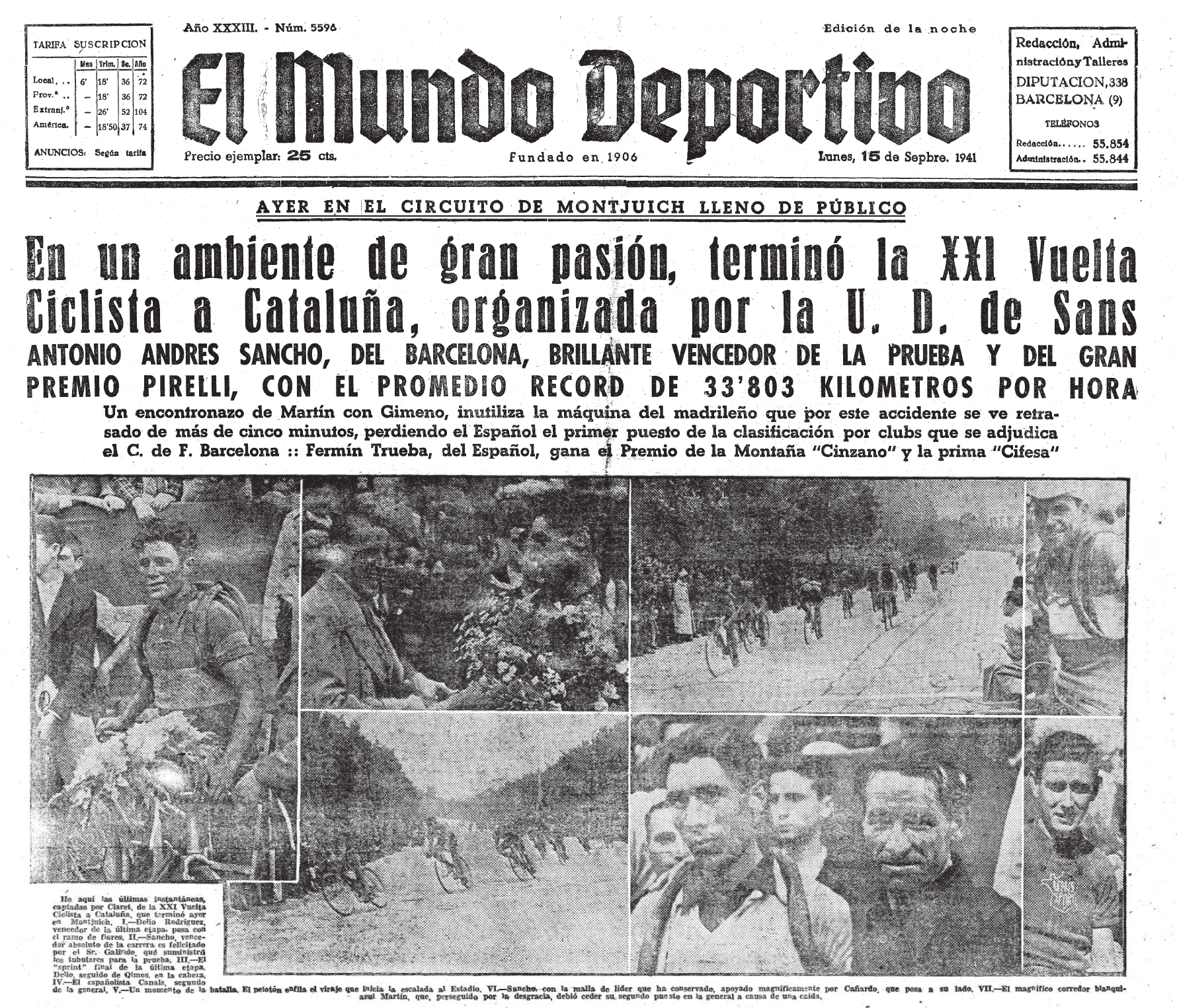 La darrera etapa portava els corredors des de Figueres fins a Montjuïc, on es farien vuit voltes al circuit portant l’etapa a una longitud de 216 quilòmetres, més del que solia ser tradicional per l’últim dia. Tot i això, la lluita es produí, tal i com s’esperava, a Montjuïc, on s’hi amuntegaven 50.000 espectadors. A la primera volta, l’aleshores segon a la general, Antonio Martín (RCDE) patí un xoc amb Juan Gimeno (FCB) que li deixà la bicicleta inutilitzable, un accident que el madrileny -sense proves- posà en dubte que no fos deliberat… Això provocà els atacs en el grup, fet que desmoralitzà a Martín qui, continuant amb la bicicleta prestada per un aficionat, acabaria deixant-se més de cinc minut en meta. El madrileny perdia així la segona plaça i la classificació per clubs, que acabava en mans del FCB amb 2’21” sobre el RCDE. La jornada acabava amb la quarta victòria d’etapa (i el parcial de Figueres) de Delio Rodríguez i el triomf a la general d’Antonio Andrés Sancho, qui va reconèixer que Cañardo havia estat “el cervell i l’ànima de l’equip” i que, sense el seu esperit combatiu, la victòria global, individual i per esquadres, hauria estat més difícil. L’Espanyol hagué de conformar-se amb el GPM, guanyat per Fermín Trueba.