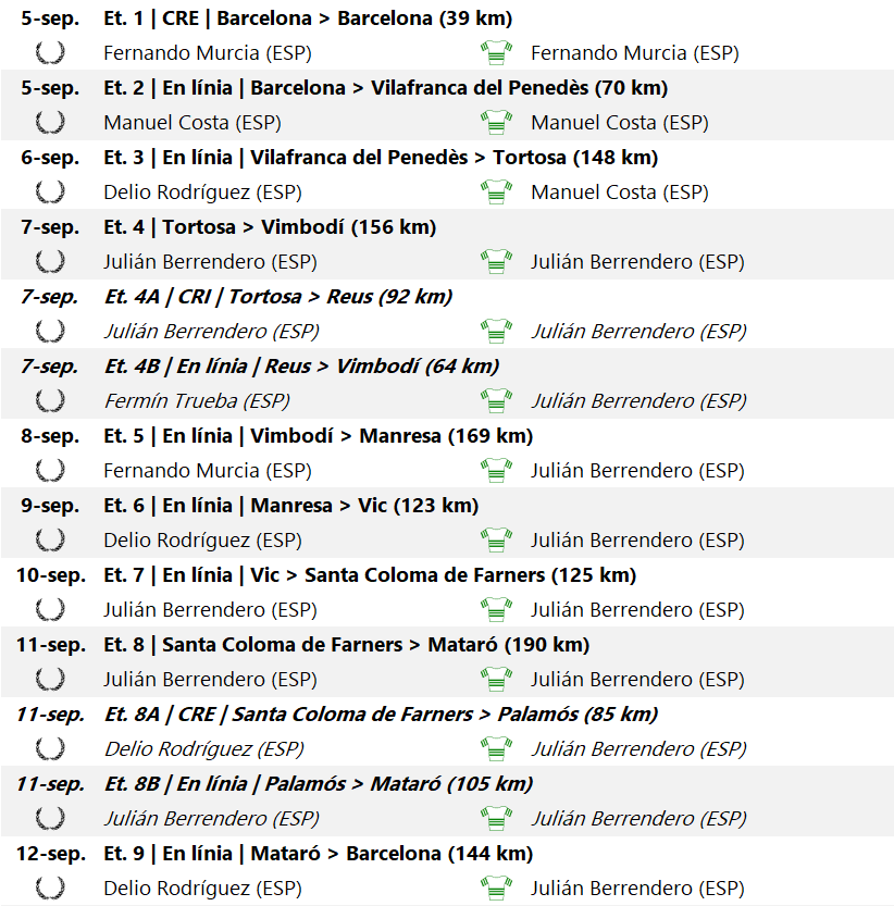- Juan GIMENO (ESP) +8m46s; 5. Fermín TRUEBA (ESP) +8m56s; 6. Fernando MURCIA (ESP) +9m34s; 7. Manuel COSTA (ESP) +11m27s; 8. Antonio Andrés SANCHO (ESP) +12m10s; 9. Delio RODRÍGUEZ (ESP) +12m45s; 10. Antonio MARTÍN (ESP) +19m34s; (…) i 42. Juan VILA (ESP) +5h29m17s