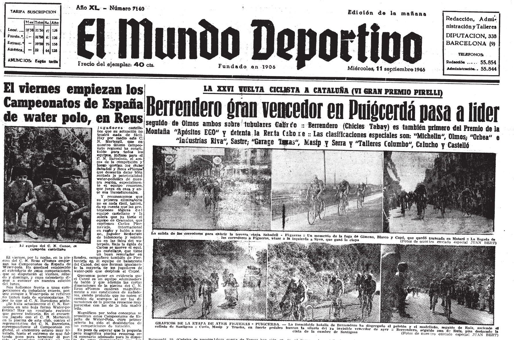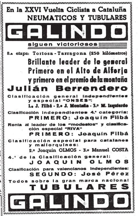 Julián Berrendero aconseguia la seva segona victòria a la general de la Volta a Catalunya, havent-se mostrat el més regular i intel·ligent, sabent que la carta que havia de jugar era la de la llarga ascensió a la Collada de Toses. A més, va salvar molt bé la seva única punxada en tota la cursa al Coll d’Alforja, sabent-se refer i demostrant que era digne del lideratge. Més mala sort va patir Olmos, qui reconegué que va prendre el risc de provar uns tubulars suïssos (“Stemberg”) que li van provocar punxades en els moments més decisius… “mireu a Berrendero, amb els Tubulars Galindo una única punxada en 1.400 quilòmetres!”. Per altra banda, els suïssos marxaren molt contents pel tracte de l’organització i per l’esportivitat dels espanyols. També reconegueren que la seva principal carta, Gottfried Weilenmann, era un home que corria més a la defensiva i que per això no va provar mai d’assaltar el liderat de Berrendero.