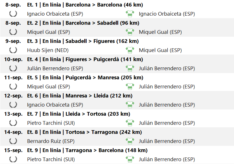 L’última etapa conduïa els corredors des de Tarragona fins a Barcelona per completar les clàssiques deu voltes al circuit de Montjuïc. Tothom hi estava d’acord en què la victòria per la general havia quedat sentenciada en favor de Berrendero, però hi havia encara emoció en la lluita per posicions secundàries, com els només dos segons entre Ruiz i Olmos. La jornada transcorregué a ritme de passeig triomfal fins a Gelida, on un atac d’Enrique Blasco encengué el gran grup. El barceloní fou caçat ràpidament, però el ritme ja no afluixà. Seguidament, Pietro Tarchini atacà permetent-se entrar en solitari a Montjuïc amb més d’un minut de marge sobre el grup de favorits. La persecució fou emocionant i el suís acabà sent caçat a l’última volta, tot i això, encara li quedaren alguns grams de força per batre a l’esprint als seus rivals, aconseguint el seu segon triomf parcial.