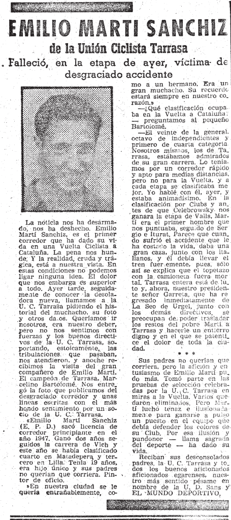 La tragèdia fou la trista protagonista en la novena etapa, entre Valls i Les Escaldes (Andorra). Emilio Martí, egarenc de la UC Terrassa, perdia la vida quan es trobava perseguint el grup capdavanter junt amb l’italià Dino Rossi, que també va patir lesions greus: fractura de fèmur i clavícula. Ambdós van ser envestits per una camioneta que pujava en direcció contrària en un tram descendent entre el Pla de Sant Tirs i La Seu d’Urgell (cal tenir en compte que, en aquella època, el trànsit no sempre estava completament tallat sinó regulat). La caravana de la Volta es va cobrir de dol per primer cop en 31 edicions d’història. Esportivament, l’etapa fou per a Manolo Rodríguez, que aprofità la vigilància entre els favorits per arrencar des d’un grup que ja venia força seleccionat des de l’entrada a Andorra. La jornada, que d’inici tenia el Coll de Lilla, s’havia començat amb força pel rumor (cert) que va córrer sobre que el líder havia passat mala nit. Tot i això, Volpi s’hi defensà molt bé entrant en el grup perseguidor del gallec amb 40” de retard. L’italià seguia de groc ara amb 2’47” sobre M. Rodríguez, 3’36” sobre Masip, 4’02” sobre Serra i 5’29” sobre Loroño, que conformaven el Top-5.