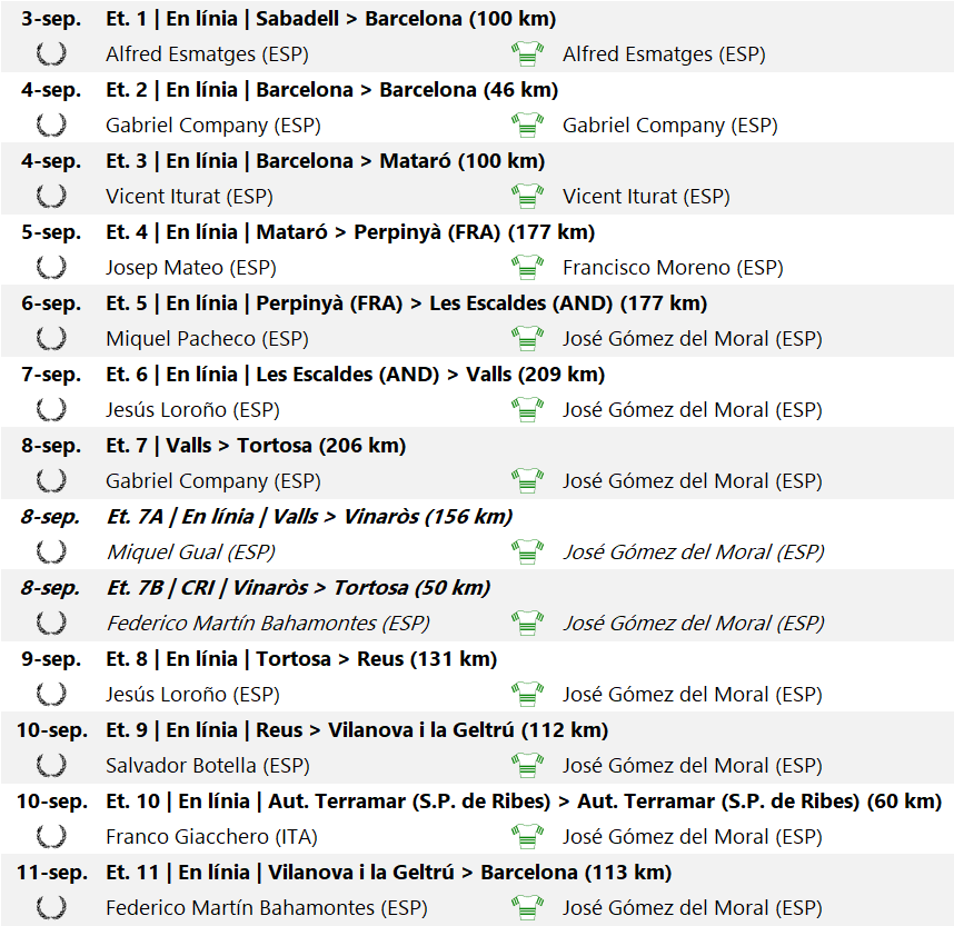 La segona etapa van ser les tradicionals dotze voltes al circuit de Montjuïc. Abans de la sortida, els allà presents celebraren la notícia que el mallorquí Guillem Timoner s’havia convertit en el primer espanyol campió del món de ciclisme, en la modalitat de mig fons darrere moto. La localitat de Palau-solità i Plegamans es buidà aquell diumenge per anar a recolzar el seu veí i líder, Esmatges, però no va poder defensar el liderat per pocs segons. L’etapa transcorregué com venia sent habitual, a ritme alt i sense grans escapades, i acabà amb un esprint final on s’imposava Gabriel Company que, amb escasses diferències, li valia per prendre el mallot groc, arrodonint així un gran dia per les Balears. El mateix dia, a la tarda, es disputà la tercera etapa, entre Barcelona i Mataró. Una fuga de Masip provocà que l’equip del líder, el Minaco-Gorila, hi treballés de valent, però provocant ells mateixos el defalliment del seu líder. Els moviments decisius arribaren a la pujada de la Font de Cera -on el públic encenia fogueres per combatre el fred i la pluja- i acabà amb la victòria i nou liderat per a Vicent Iturat després de formar un grupet amb Botella, Escolà, Moreno, Esmatges, Guitart i Dussault.