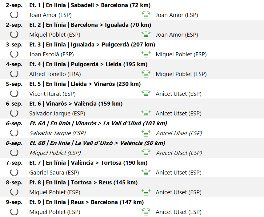 - Miquel POBLET (ESP) +4m15s; 5. Antoni GELABERT (ESP) +4m20s; 6. Juan CRESPO (ESP) +5m16s; 7. Juan ESCOLÁ (ESP) +6m30s; 8. Walter SERENA (ITA) +7m53s; 9. Jaime CALUCHO (ESP) +9m17s; 10. José ESCOLANO (ESP) +9m20s; (…) i 50. Juan BASAS (ESP) +4h26m32s