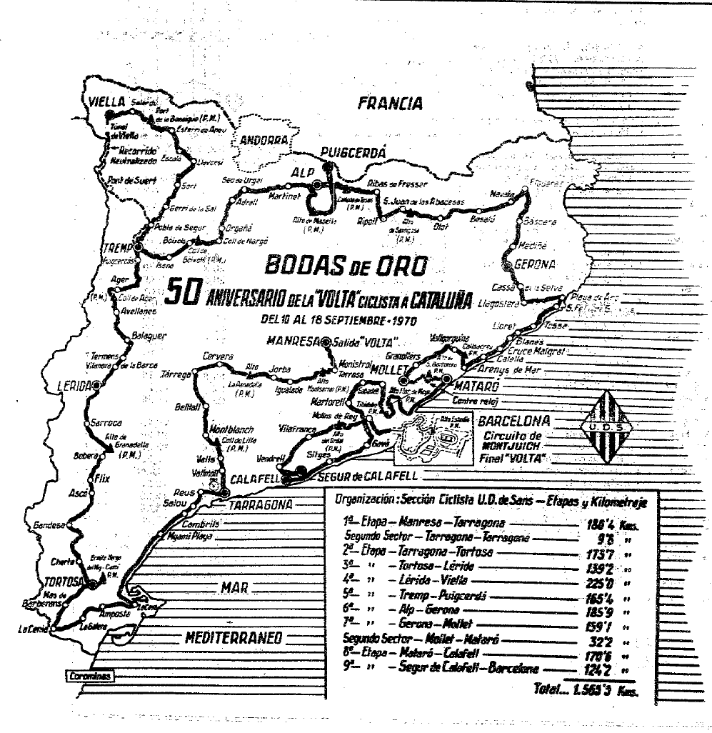 La Volta a Catalunya entrava a la dècada dels setanta amb la celebració de l’edició de les noces d’or, la cinquantena. Aquesta presentava un recorregut que, mirant el mapa, donava literalment la volta a Catalunya amb una sortida des de Manresa, fins les Terres de l’Ebre, pujada a la Vall d’Aran, continuació per la Cerdanya, Girona i baixada fins Barcelona, i tot incloent-hi finals d’etapa a les quatre capitals de província. Per donar-li un toc més malenconiós, el director de la cursa fou Miguel Torelló -fent cas omís als consells del seu metge-, que també exercí el càrrec a l’edició de les noces de plata, la de 1945. Les autoritats principals de Barcelona, que celebrava també en aquelles dates els europeus de natació, van homenatjar la cursa al “Palacio de las Naciones” (ara Palau Nacional de Montjuïc), en una gala nocturna que comptà també amb la presència de llegendes de la ronda catalana com Cañardo, Poblet o Luis Puig.