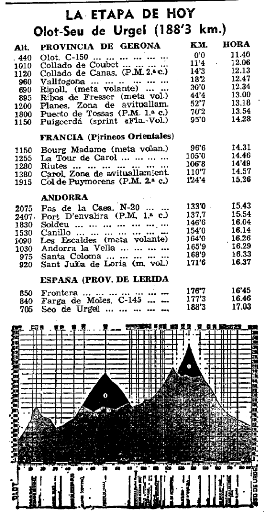 El càntabre era poc optimista de cara a poder mantenir el liderat a la tercera etapa, doncs l’alta muntanya no era un terreny per a ell i tothom temia aquesta jornada, entre Olot i la Seu d’Urgell amb els alts de Canes, Collada de Toses, Puymorens i Envalira, amb els seus 2.408 metres d’altitud. Però la meteorologia es va posar del costat de González Linares, la neu va obligar a anul·lar els passos pels dos últims ports, excloent-hi de la ruta les incursions per França i Andorra i, per tant, dirigint-se a La Seu d’Urgell per la via directa des de Puigcerdà. Als corredors els van avisar molt tard, tot just quan baixaven la Collada de Toses. Gimondi va declarar-se com un dels grans perjudicats, doncs tenia planificat atacar i vestir-se de líder en aquesta jornada. La Gendarmeria francesa fou la responsable de la decisió, que va ser molt criticada perquè molts testimonis declaraven que la carretera estava en condicions… La que sobre el paper era l’etapa reina acabà amb un nou esprint massiu i una altra victòria per a “Txomin” Perurena -la cinquena consecutiva del KAS- per davant de Gimondi, que amb les bonificacions es col·locava a 50” de González Linares.