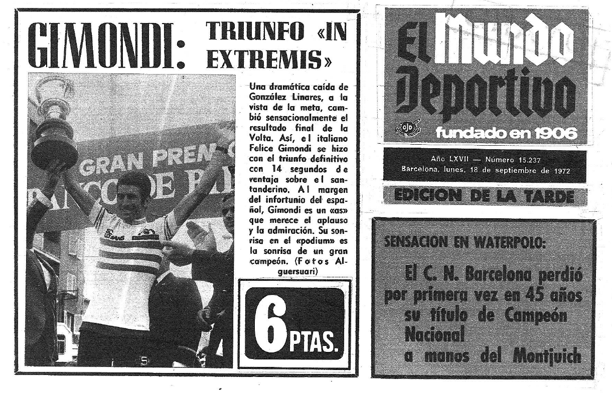 Felice Gimondi guanyava per fi la Volta a Catalunya, en la seva quarta participació. Una Volta que semblava truncada després de l’anul·lació de la part decisiva de l’etapa reina, on l’italià hi havia ficat totes les seves esperances. Sense desmerèixer a González Linares, la Volta continuava omplint un palmarès de gran qualitat. Gimondi tenia una espina clavada des de la seva primera participació a la Volta, on havia estat derrotat pel seu major rival històric, Eddy Merckx, la de 1968: “Per mi, guanyar la Volta tenia tanta importància com fer una bona classificació a Tour o Giro. La Volta em seduïa i hi vaig venir amb intenció de guanyar-la”.