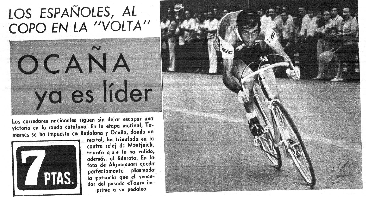 El duel Ocaña-Fuente havia quedat clar en els preliminars de la Volta. El Trofeu Masferrer es destacà per la vigilància mútua entre els dos asos, que van acabar cedint vuit minuts. Amposta va acollir, per primer cop, la sortida de la Volta amb un pròleg de 4,7 quilòmetres. Jesús Manzaneque va guanyar el duel entre manxecs, superant a Ocaña en tres segons, repetint així la victòria recent a la Volta a Cantàbria també sobre el de Cuenca. Les diferències van ser escasses degut a la curta distància de la contrarellotge. Josep Pesarrodona era tercer, a quatre segons, i és que el de Sant Salvador de Guardiola retornava les il·lusions als catalans, que tornaven a tenir un favorit procedent de les seves terres… l’espera s’havia fet llarga des de Miquel Poblet.