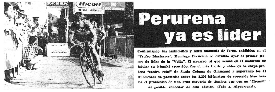 Seguint la dinàmica d’altres anys, la Volta s’inicià amb un pròleg de 2,3 quilòmetres a Santa Coloma de Gramenet, sobre un circuit urbà amb inici i final a la Plaça Nacional (Plaça de la Vila). S’hi imposà Domingo Perurena confirmant així les seves ambicions i bon moment de forma ja exhibits al Trofeu Masferrer, reivindicant-se també després del fracàs al Mundial -guanyat per l’holandès Hennie Kuiper, setè a l’anterior Volta-. Amb un traçat tan curt les diferències van ser, lògicament, escasses. Jesús Manzaneque va igualar el temps del guipuscoà, però quedava segon per centèsimes. Galdós, en canvi, va patir una caiguda contra el públic i va deixar-se 39”.