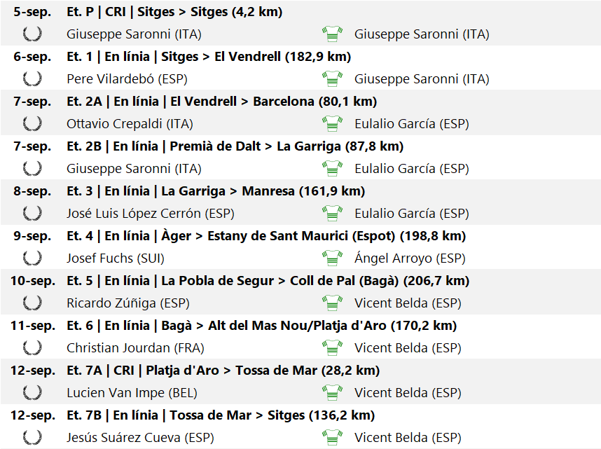 Vicent Belda es feia amb el millor regal d’aniversari, 25 anys feia aquell 12 de setembre, la millor victòria que consta en la seva trajectòria. L’alacantí fitxaria pel Kelme la temporada següent, el nou equip espanyol que escriuria moltes de les pàgines del ciclisme espanyol: “la cursa ha estat molt dura, una prova són els múltiples abandonaments que s’han produït, en especial el de Saronni”. I és que només vint-i-cinc corredors van concloure a Sitges dels setanta-un sortits una setmana abans. L’abandonament de l’as italià provocà que la general es dinamités a cadascuna de les jornades restants. Només dos segons van acabar privant a la Volta de tenir un nou vencedor català, Pere Vilardebó es quedava sense poder prendre el relleu de Poblet, que havia guanyat la seva segona Volta l’any 1960.