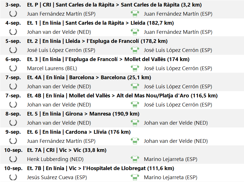 - Faustino RUPÉREZ (ESP) +2m44s; 5. Antonio COLL (ESP) +2m53s; 6. Sven Ake NILSSON (SWE) +3m39s; 7. Ismael LEJARRETA (ESP) +3m42s; 8. Alberto FERNÁNDEZ (ESP) +3m58s; 9. José Luis VIEJO (ESP) +4m17s; 10. Juan FERNÁNDEZ (ESP) +5m32s; (…) i 43. Luis Alberto ORDIALES (ESP) +58m58s