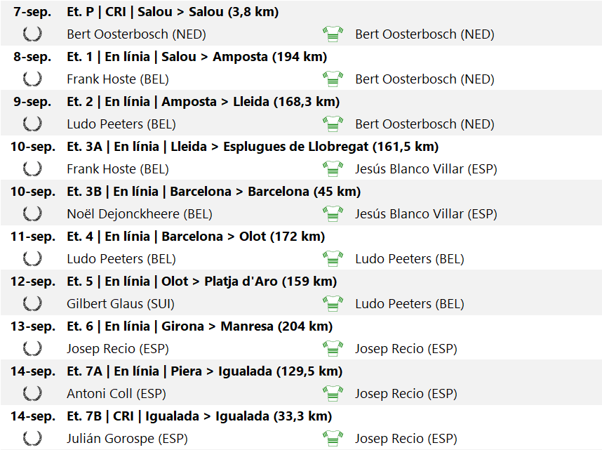 La primera etapa en línia, entre Salou i Amposta, no va tenir més notícia que la victòria a l’esprint de Frank Hoste, un altre conegut en la seva especialitat. El belga havia guanyat aquell any etapes a Giro, Tour i tres etapes a la Volta a Suïssa.