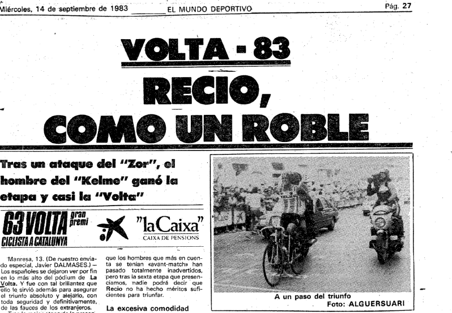 Josep Recio rebia el trofeu de vencedor de mans de dues eminències al podi: el President de la Generalitat, Jordi Pujol, i el president de la UCI, Lluis Puig. El catalano-cordovès havia aprofitat el marcatge del Zor i Reynolds en la penúltima jornada per donar un cop letal a la cursa. Estava esdevenint una tendència en els darrers anys que la cursa embogís un dia ficant tot potes enlaire, enviant els pronòstics a fer norris. Hi havia un element comú: el Raleigh. L’equip holandès portava quatre anys seguits perdent la Volta de maneres similars, tres amb Van der Velde i aquest any amb Peeters, qui declarava que el seu equip l’havia traït: “si ells haguessin volgut, Recio no arriba a Manresa en solitari”. El belga no dormí en tota la nit i va acabar caient fins a la quinzena posició de la general. L’equip va acabar dissolent-se a finals de temporada després de les tensions entre Jan Raas i el director esportiu Peter Post.
