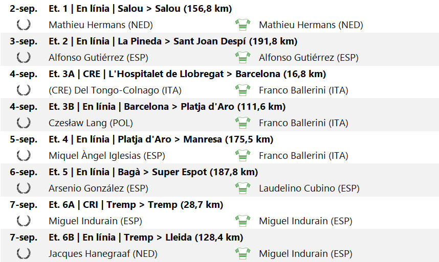 Es preveia molt complicat que Cubino salvés els 17” que tenia de renda sobre Indurain en els 29,7 quilòmetres de contrarellotge a Tremp. Però el de Béjar va vendre car el blanc-i-verd, doncs el va acabar perdent per només 8”! Cubino va signar la seva millor contrarellotge amb un segon lloc, a 25” de Miguel Indurain, vencedor de l’etapa. I és que la presència de l’Alt de l’Acadèmia va donar opcions a corredors amb perfil més d’escalador. A la tarda, l’etapa transcorregué amb múltiples escapades, en especial a la zona de Comiols, però sense cap amb homes importants. Ja en els carrers de Lleida, escapà Jacques Hanegraaf obtenint un forat suficient per presentar-se en meta en solitari.