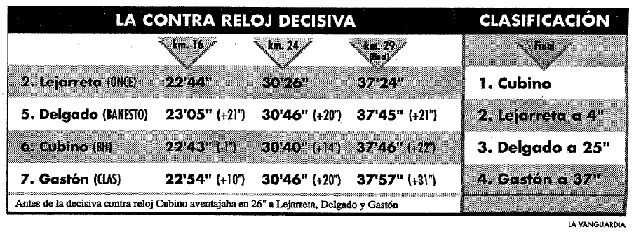 Laudelino Cubino guanyava la Volta a Catalunya, la fita més important del seu palmarès. Per al de Béjar suposava una injecció de moral després d’una temporada marcada per problemes físics al genoll que el van deixar sense córrer La Vuelta. Va retornar amb victòries al campionat d’Espanya i a una etapa de la Volta a Galícia. Hi sumava ara la ronda catalana i, un parell de setmanes després, triomfaria a la Subida al Naranco. “Amb la contrarellotge per equips de ben segur que hauríem guanyat”, deia Manolo Saiz, director de l’ONCE. I és que Lejarreta s’havia quedat a només quatre segons de sumar la seva tercera Volta, amb 33 anys i havent tornat a córrer les tres grans voltes en un sol any. Pedro Delgado, tercer a 26”, completava un podi íntegrament espanyol per quart any consecutiu. Passaven els anys i al segovià se li seguien escapant les oportunitats de fer-se algun any amb la Volta.