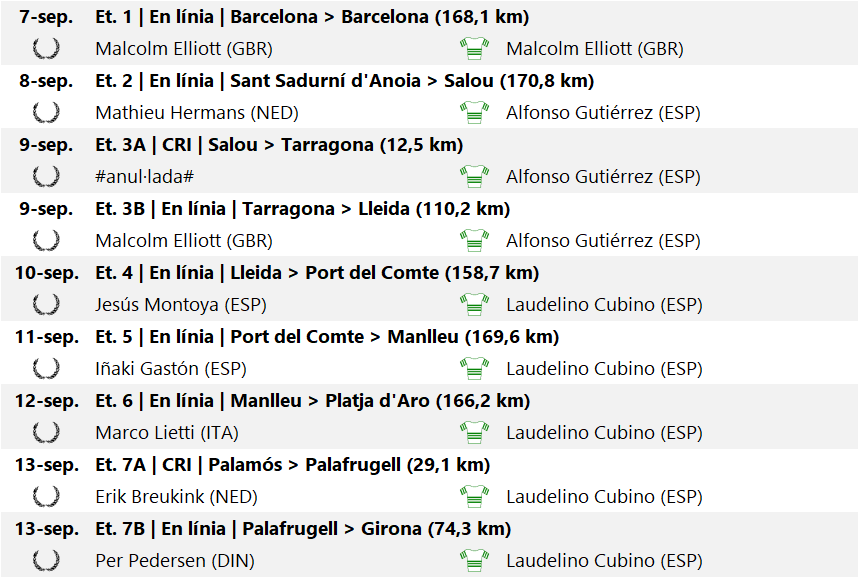 - Iñaki GASTÓN (ESP) +37s; 5. Federico ETXABE (ESP) +1m36s; 6. Enrique AJA (ESP) +2m18s; 7. Óscar de Jesús VARGAS (COL) +2m30s; 8. Jesús MONTOYA (ESP) +3m7s; 9. Sean KELLY (IRL) +3m32s; 10. Edgar CORREDOR (COL) +5m0s; (…) i 137. John TALEN (NED) +1h14m15s
