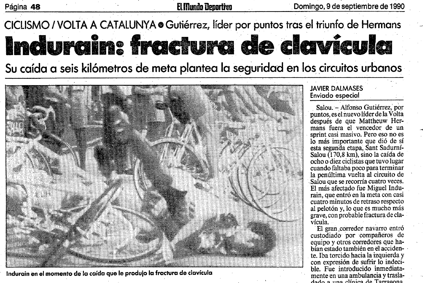 A l’endemà es repetí una nova arribada a l’esprint amb victòria per a Mathieu Hermans, que seguia sense fallar a la Volta per tercer any consecutiu. El blanc-i-verd canviava de propietari i passava a les esquenes d’Alfonso Gutiérrez, beneficiat per la suma de llocs. La notícia del dia fou, però, la caiguda de Miguel Indurain dins del circuit de Salou, quan restaven vuit quilòmetres per a la conclusió. El navarrès aconseguí acabar l’etapa amb quatre minuts perduts, acompanyat de tots els membres del Banesto a excepció de Delgado i Gorospe. Els exàmens mèdics revelaven una fractura de clavícula, obligant-lo a abandonar: “En aquest circuit tenim un malastruc, fa dos anys perdíem totes les opcions amb Delgado i avui el malparat ha estat Indurain”, declarava Echávarri (DS Banesto).