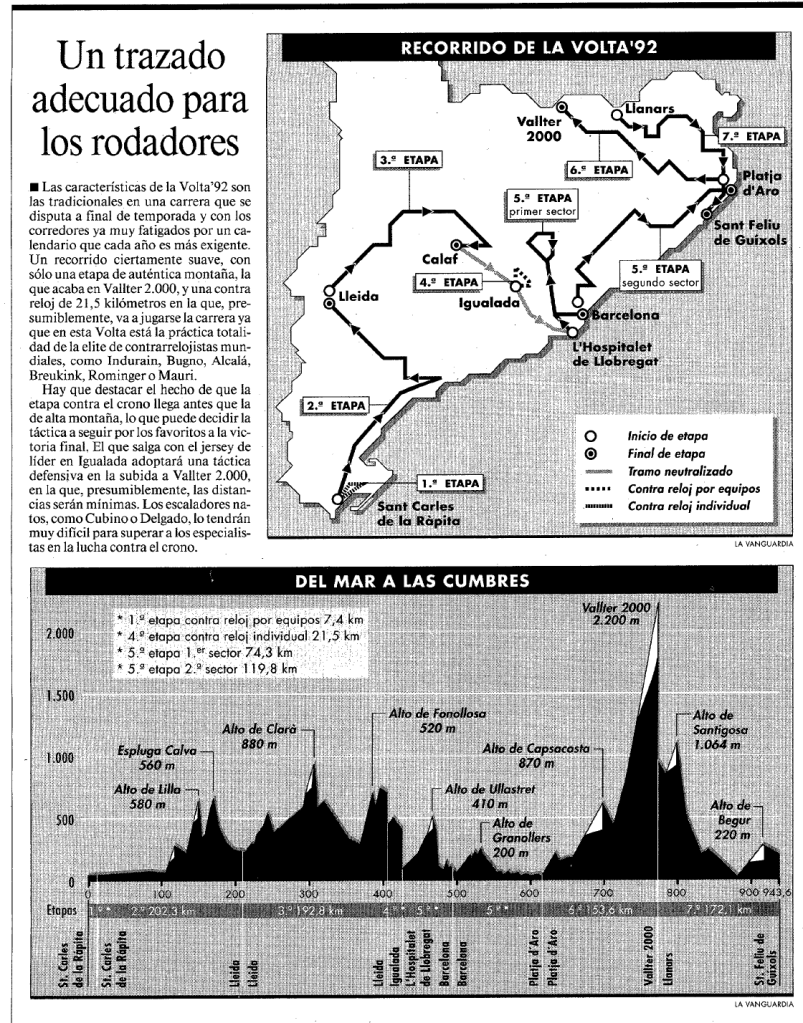 El 1992 fou un any clau per a la marca Barcelona amb la celebració dels Jocs Olímpics. Un mes després de la gran festa esportiva, la Volta a Catalunya disputava una setanta-dosena edició que va tenir el risc de no celebrar-se: el relleu a la presidència de la UE Sants -amb Albert Maria Galán com a nou màxim representant- va provocar la ruptura del contracte amb Unipublic. Tot i que es va poder mantenir el patrocini amb La Caixa, sí que es perdia, de forma automàtica, l’acord amb TVE. Afortunadament, negociacions d’última hora van resoldre’s amb la renovació per quatre anys més amb la cadena pública de l’Estat. I la ronda catalana presentà una de les seves millors participacions de la història aconseguint reunir el vencedor de Giro i Tour (Miguel Indurain), Vuelta (Tony Rominger) i l’or i la plata del campionat del món celebrat a Benidorm (Gianni Bugno i Laurent Jalabert). De primeres, el duel entre el mallot irisat -present per segon cop a la història a la Volta (Maertens, 1981)- i Indurain era el principal focus d’atenció.