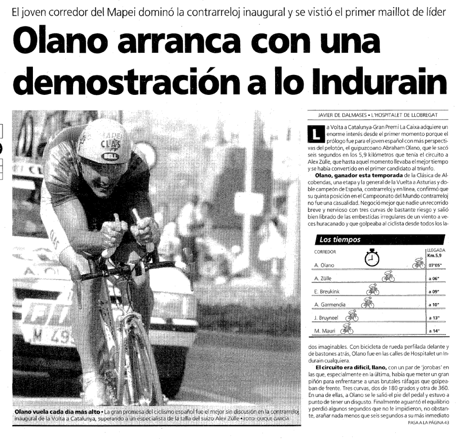 Una contrarellotge a L’Hospitalet de Llobregat va ser l’encarregada d’inaugurar la Volta. D’aquesta sortí vencedor Abraham Olano, “la gran promesa del ciclisme espanyol”, que aquell any s’havia proclamat campió nacional en ruta i contrarellotge, alhora que era cinquè al campionat del món d’aquesta última modalitat. Tot i això, el guipuscoà fou sancionat en posterioritat a la conclusió de la Volta en donar positiu per cafeïna -aleshores substància prohibida-. Se li van imposar 10 minuts de penalització sent desposseït de la victòria d’etapa i del Top-10 final a la general. L’etapa fou atorgada a Alex Zülle, originalment segon a 6”.