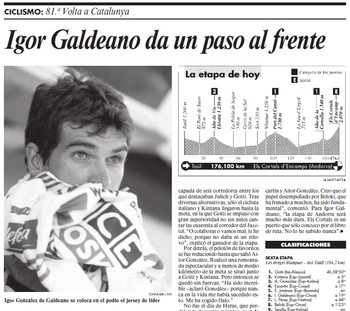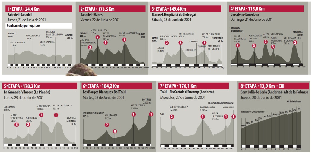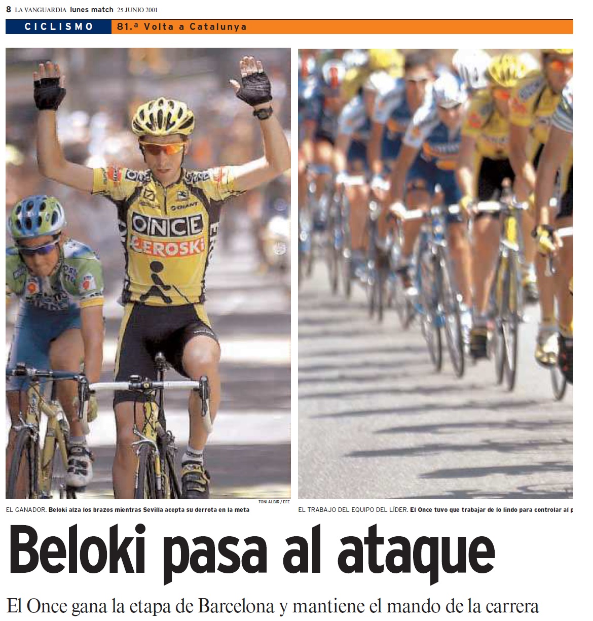 Joseba Beloki guanyava la Volta a Catalunya amb 33” sobre el seu company d’equip, Igor González de Galdeano: “No hi ha res més bonic que jugar-se la victòria contra un amic i company d’habitació”. Fou una prova liderada de principi a fi per l’ONCE, que presentava les seves credencials per al Tour de França amb un líder clar, que havia passat a ser l’esperança del ciclisme espanyol. Beloki ja havia fet podi al Tour del 2000, però era difícil considerar-lo al mateix nivell que Lance Armstrong, que es coronava, en paral·lel, a la Volta a Suïssa. Al juliol, el nord-americà guanyaria el seu tercer Tour mentre que Beloki repetiria amb un tercer lloc.