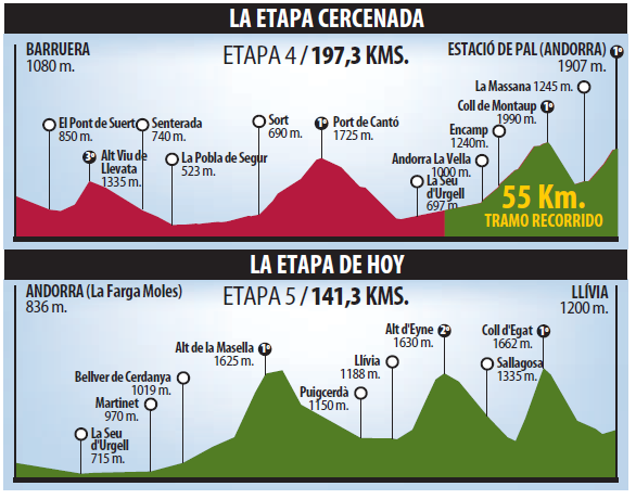 El Kelme va demostrar-li a Heras que no podia relaxar-se fins arribar a Barcelona. Els alacantins van posar en serioses dificultats el US Postal en la primera dificultat de la cinquena etapa, entre Andorra La Vella i Llívia, a La Masella. La cursa entrà en una segona fase en posterioritat, i la victòria sorgí novament d’una escapada. José Manuel Maestre acabà marxant tot sol després de deixar els seus dos acompanyants, Juan Carlos Guillamón i Íñigo Cuesta, al Col d’Egat -a la Cerdanya francesa-. El madrileny cavalcà en solitari i aconseguí resistir a un contraatac des del gran grup per part d’Iván Parra (nebot de Fabio) i Joan Antoni Flecha. Maestre acabava imposant-se a Llívia en solitari amb poc menys de mig minut de marge sobre el gran grup, d’una trentena, que encapçalà un tal Alejandro Valverde (22).