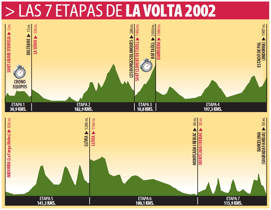 La vuitanta-dosena edició de la Volta a Catalunya canviava de dates, seguia sent al juny però passant a ser de dilluns a diumenge (en comptes de dijous a dijous). Això feia que la cursa perdés un dia, però permetia ubicar l’etapa de Barcelona en l’últim dia -aturar la capital només es podia fer en diumenge- i l’alta muntanya no havia d’esperar al final. Malgrat l’atractiu recorregut que es dissenyava cada any, ideal per a la preparació del Tour, les grans figures internacionals no venien a la Volta… Sense Armstrong, però aquest cop també sense Beloki, Igor González de Galdeano, Sevilla o Botero, protagonistes en l’anterior edició. A més, aquell any, la vaga general convocada per al 20 de juny -per la reforma del subsidi d’atur aprovat pel govern d’Aznar- afectava de ple a l’etapa reina. S’arribà a l’inici de la Volta amb la incertesa de saber si es correria o no aquell dia.