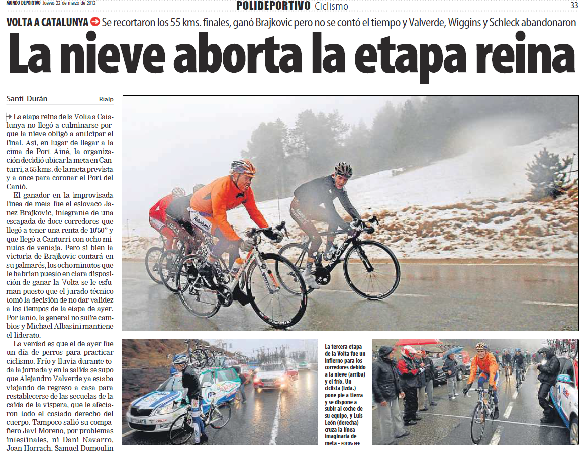 Els pitjors pronòstics es van complir. La Volta feia dies que mirava el cel per a aquella jornada de dimecres, dia de l’etapa reina. Es va sortir des de Sant Esteve d’en Bas amb fred i pluja, s’afrontaren els alts de Coubet i Toses, però a l’arribada al Cantó, l’organització va veure’s obligada a retallar l’etapa, donant-la per finalitzada amb una línia de meta improvisada a Canturri (a 1.300 metres). Nevava al cim, deixant el descens perillós i la meta de Port Ainé del tot impracticable. La victòria d’etapa se l’endugué Janez Brajkovic des d’un grup de dotze escapats: “He estat capaç de donar tot el que tenia i he tingut molta sort de guanyar, perquè ningú sabia on estava la línia d’arribada. Ha estat el dia més dur de la meva carrera. A partir del segon port, l’únic objectiu era seguir viu”. Enfadadíssim es mostrava Mickael Chérel, que també formava part del grup capdavanter que es presentà amb vuit minuts sobre el grup del líder. El francès hauria estat líder virtual, però el jurat tècnic va decidir no tenir en compte els temps de la general: “Ens forcen a acabar a meitat d’un port, acceptem sense protestar i després anul·len l’etapa. On és el respecte?”.
