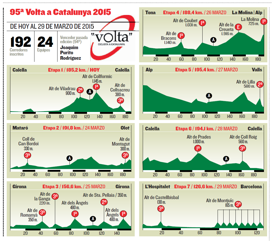 La noranta-cinquena edició de la Volta Catalunya començava amb la notícia de la baixa d’última hora del vencedor de l’anterior edició, Joaquim Rodríguez. El corredor català no podia defensar el títol a causa d’un virus estomacal i es veia obligat a reprogramar el seu calendari amb la Volta al País Basc, que acabaria guanyant dues setmanes després. Tot i això, la Volta havia aconseguit mantenir el nivell de qualitat envejable dels darrers anys, centrant-se l’atenció en el duel entre Alberto Contador i Chris Froome, a més d’altres favorits destacables com Alejandro Valverde, Richie Porte, Romain Bardet, Tejay Van Garderen, Fabio Aru, Dan Martin, Rafal Majka o Rigoberto Urán. Sense el “Purito”, el dorsal “1” requeia en el seu fidel gregari, Alberto Losada. Els altres catalans presents eren Marc Soler, David de la Cruz i Edu Prades. Les bonificacions es preveien importants per l’absència de contrarellotge i un únic final en alt, a La Molina.