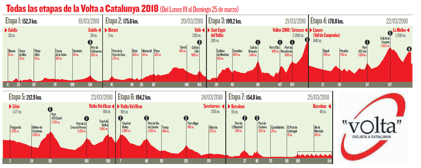 Les bonificacions i els dos finals en alt (La Molina i Vallter 2000 -finalment, suspès-) es preveien claus en un any en què es tornava a prescindir de la contrarellotge. Tanmateix, l’organització de la Volta feia un pas endavant en l’aposta pel ciclisme femení, oferint la primera edició de la cursa femenina, batejada per votació a les xarxes socials com a “ReVolta”. La prova tindria lloc a Montjuïc coincidint amb el darrer dia de cursa dels homes.