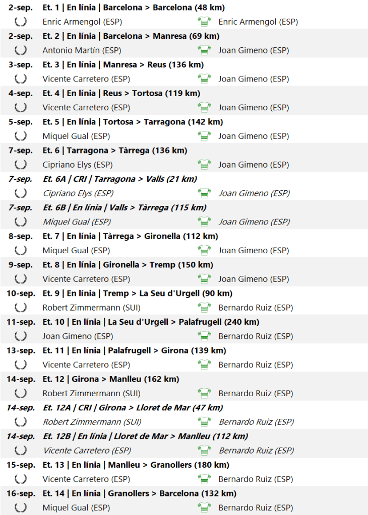 - Vicente CARRETERO (ESP) +15m22s; 5. Antonio Andrés SANCHO (ESP) +22m23s; 6. Arturo DORSÉ (ESP) +33m22s; 7. Joao REBELO (POR) +47m57s; 8. Joaquín FILBÁ (ESP) +56m11s; 9. Miquel GUAL (ESP) +56m29s; 10. Cipriano ELYS (ESP) +59m43s; (…) i 27. Miguel GARCÍA VINUESA (ESP) +5h45m3s
