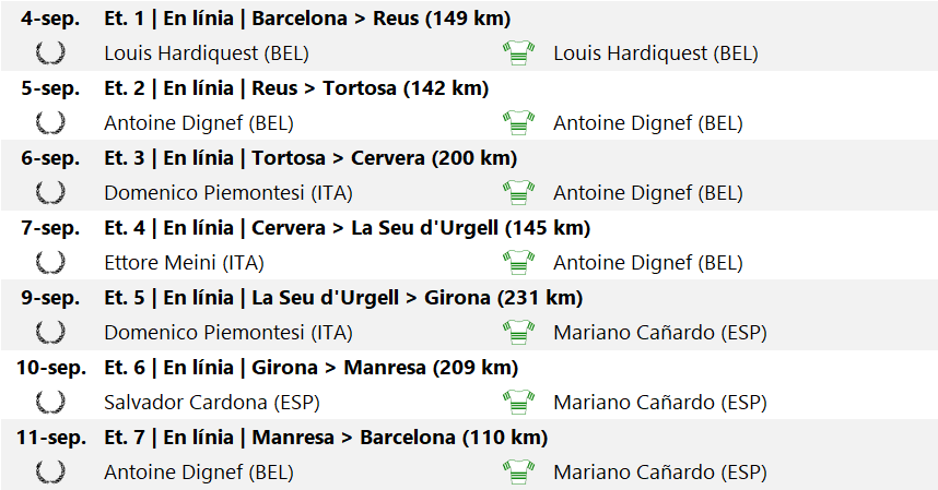 - Vicente TRUEBA (ESP) +1h5m18s; 5. Felice GREMO (ITA) +1h9m27s; 6. Luigi MARCHISIO (ITA) +1h26m51s; 7. Federico EZQUERRA (ESP) +1h30m44s; 8. Vicente BACHERO (ESP) +1h31m3s; 9. Emile DECROIX (BEL) +1h34m45s; 10. José NICOLAU (ESP) +1h37m24s; (…) i 40. Rafael CARRIÓN (ESP) +12h2m16s