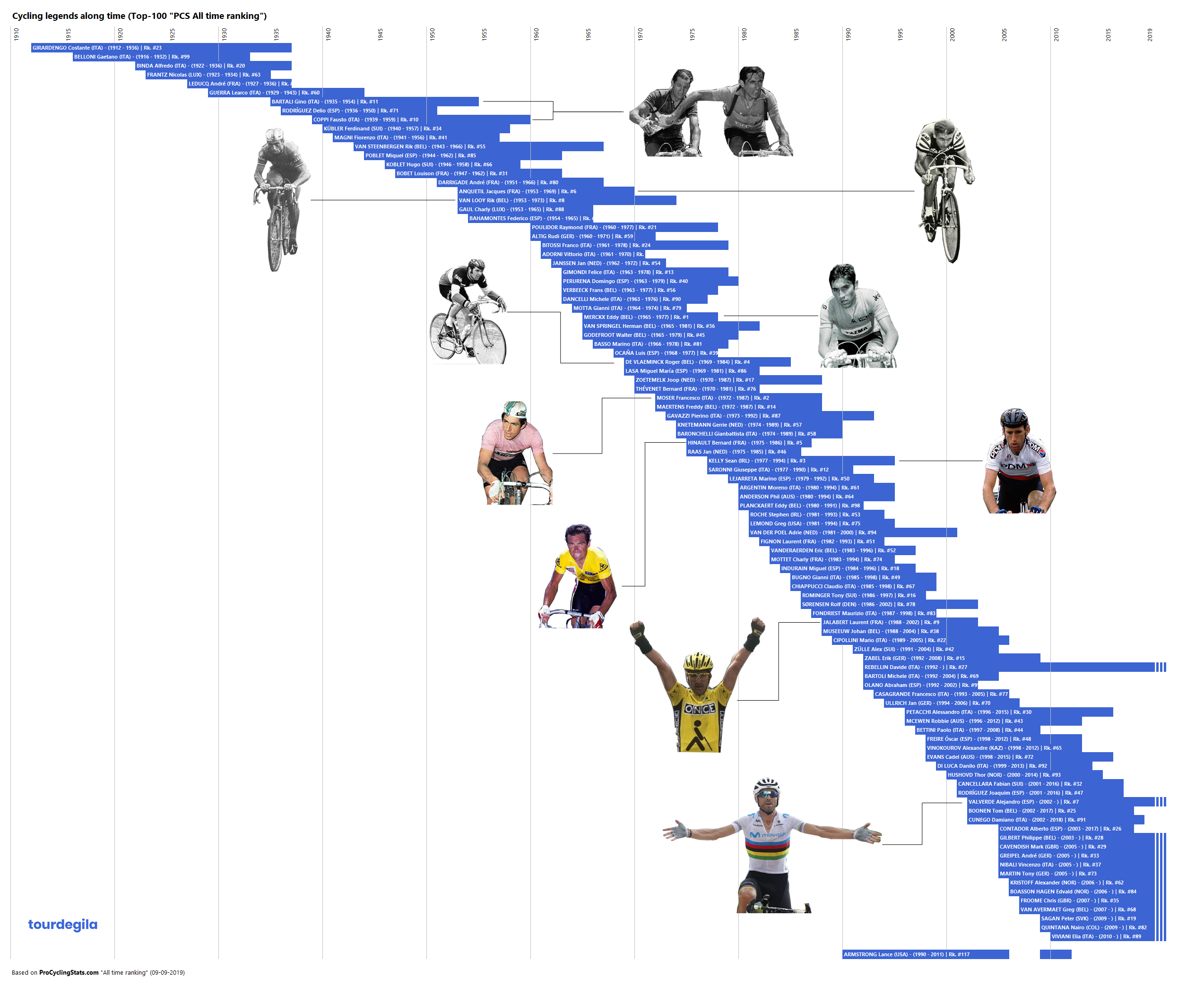 It could be basic questions that someone asks himself when they start, as a fan, in the world of cycling, but perhaps there were also some that even the most involved have failed to answer. The chart presented below has the simple objective of placing the historical legends of cycling on a timeline of more than a century.