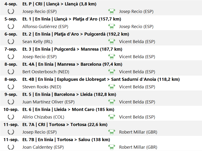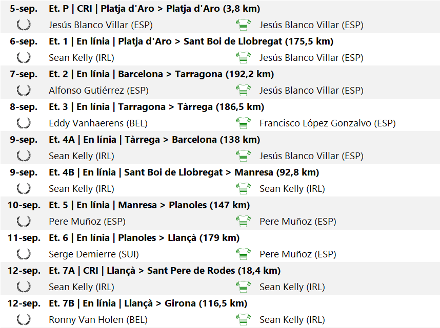 - Vicente BELDA (ESP) +36s; 5. Francisco “Pacho” RODRÍGUEZ (COL) +1m42s; 6. Robert FOREST (FRA) +2m6s; 7. Álvaro PINO (ESP) +2m38s; 8. Celestino PRIETO (ESP) +2m47s; 9. Pedro DELGADO (ESP) +3m17s; 10. Federico ETXABE (ESP) +3m53s; (…) i 64. Philippe LOUVIOT (FRA) +1h1m50s