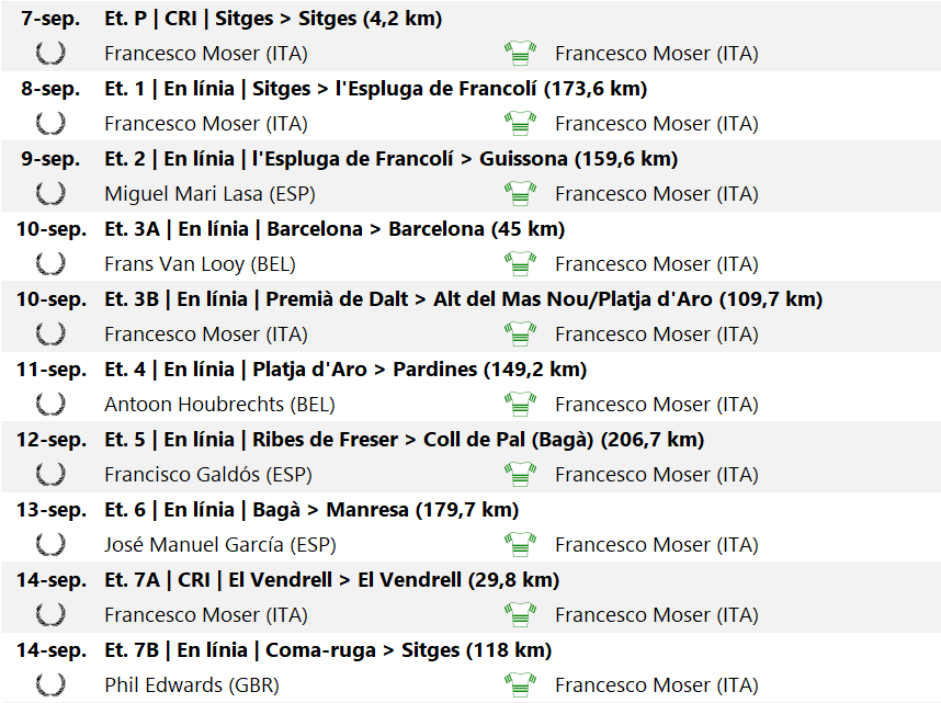 - Faustino RUPÉREZ (ESP) +2m44s; 5. Antonio COLL (ESP) +2m53s; 6. Sven Ake NILSSON (SWE) +3m39s; 7. Ismael LEJARRETA (ESP) +3m42s; 8. Alberto FERNÁNDEZ (ESP) +3m58s; 9. José Luis VIEJO (ESP) +4m17s; 10. Juan FERNÁNDEZ (ESP) +5m32s; (…) i 43. Luis Alberto ORDIALES (ESP) +58m58s